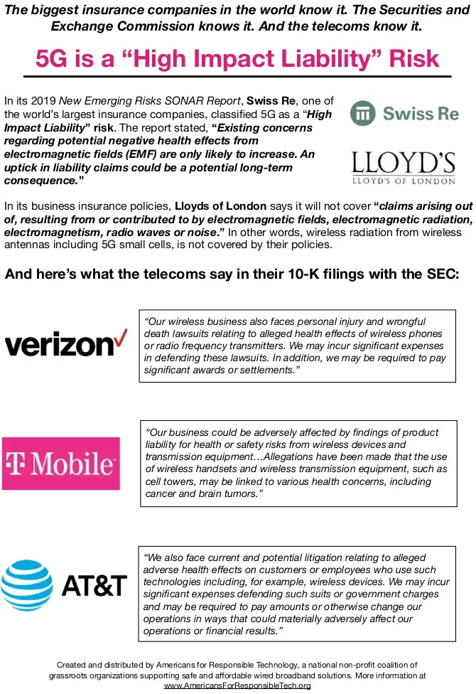 In short, these companies, and even our FCC, all know that the radiation emitted from the towers and devices are a major health risk and, as such, massive funds have been set aside to cover related legal fees and court cases that have and will continue to arise.