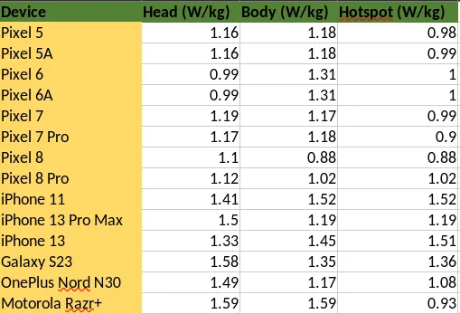 Although we were relieved to see that the SAR values for Pixel devices (which are what we use for our Ghost Phones) are much lower than those in some of the most popular iPhones and other non-Apple devices, there really is no “safe” level of radiation in any of these phones. This is especially the case when facing prolonged exposure, which most of us are exposed to when we keep them in our pockets, in front of our faces, or held to our ear while on calls.